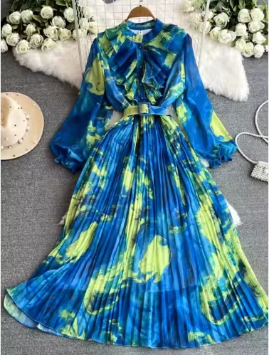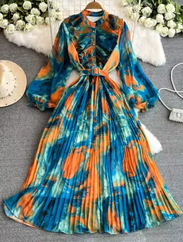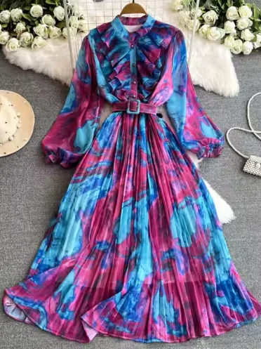 Elegant Vintage Women's Midi-Length Floral Print Skirt High-Collar Long-Sleeve with Ruffled Waist Zipper Decoration Sweet Style